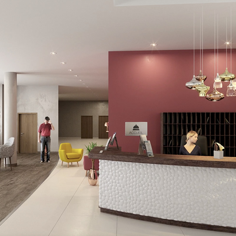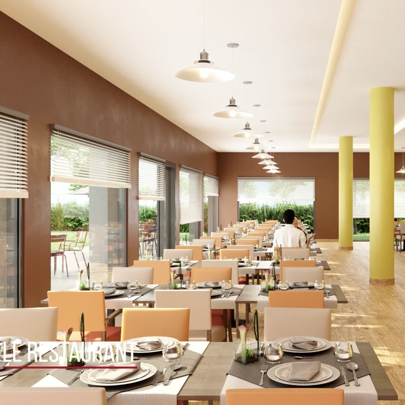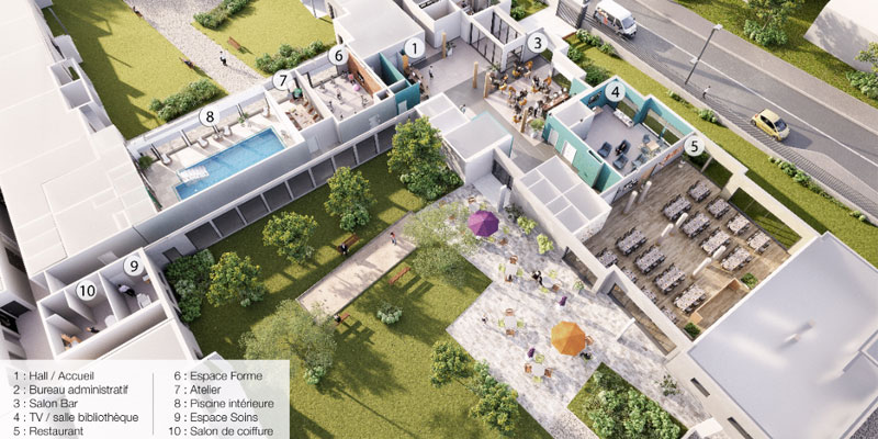 La résidence est constituée d’une zone d’exploitation en rez de chausssée  regroupant de nombreux services : piscine, coiffeur, salle de sports, restaurant …